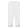 Pantaloni Twinset da donna, modello CROPPED, in popeline di cotone stretch, fondo rifinito in pizzo macramè smerlato in tono, vita regolare, tasche alla francese, chiusura con zip al fianco, placchetta logo Oval T sul retro, linea dritta, colore bianco neve.